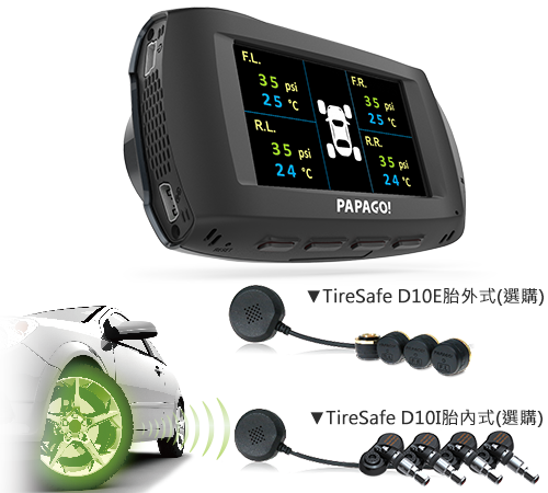 搭配專用胎壓偵測套件,支援TireSafe D10E胎外式及TireSafe D10I胎內式,隨時自動偵測胎壓胎溫,減少爆胎發生。