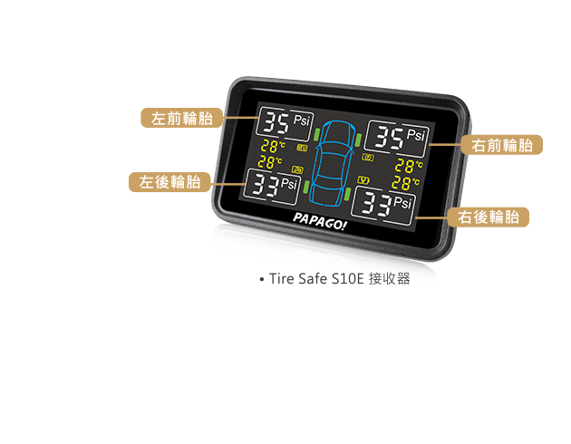 在行駛過程中,不間斷偵測輪胎胎壓及溫度狀況,當車輛行進間輪胎壓力超過 3.2Bar / 46Psi 以上或低 1.8Bar / 26Psi 以下時,即會發出警報;輪胎溫度超過 65℃ 時,亦會發出警報,提醒在行車的你適時減速停車檢修,避免意外發生。